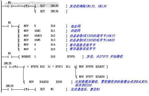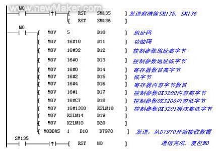 5、具體程序編寫:啟動5#變頻器正轉(zhuǎn),轉(zhuǎn)速設(shè)定為50.00HZ(內(nèi)部表示為5000)的命令如下: