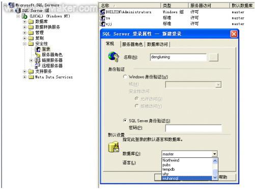 這里的用戶名和密碼是在SQL Server中建立的。在SQL Server數(shù)據(jù)庫中選擇 安全性->登錄,新建用戶,如圖6所示。