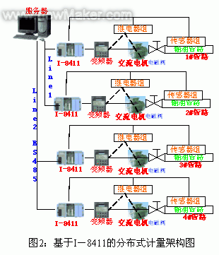 在小型石油公司中,要進(jìn)行大量的油料計(jì)量工作如輕油、0#汽油、90#汽油等,其計(jì)量過(guò)程往往是車(chē)隊(duì)從貨運(yùn)站拖回公司后經(jīng)公司磅房過(guò)磅稱(chēng)毛重、卸料、車(chē)輛出廠時(shí),再過(guò)磅稱(chēng)車(chē)重等等,過(guò)磅過(guò)程、手續(xù)、登記極其繁瑣,有時(shí)還容易出現(xiàn)錯(cuò)磅和漏磅現(xiàn)象,極不容易管理,并且給統(tǒng)計(jì)、計(jì)量工作帶來(lái)了極大的困難,過(guò)磅工人的勞動(dòng)強(qiáng)度大,經(jīng)常出現(xiàn)車(chē)隊(duì)排隊(duì)過(guò)磅的現(xiàn)象,辦事效率極其低下,為改變這種局勢(shì),采用PC-Based PLC I-8411嵌入式控制,并配以模擬信號(hào)輸入模塊I-8017H、模擬信號(hào)輸出模塊I-8024、光隔離數(shù)字輸入/輸出模塊I-8042、I-8060繼電器輸出模塊以及RS232/RS485轉(zhuǎn)換器I-7520,并利用計(jì)算機(jī)控制技術(shù),為其不同的油料的進(jìn)站計(jì)量、出站計(jì)量、統(tǒng)計(jì)等開(kāi)發(fā)了一套分布式的油料計(jì)量、統(tǒng)計(jì)管理系統(tǒng),省時(shí)又省力,深得用戶(hù)喜愛(ài)。系統(tǒng)架構(gòu)圖件圖2所示。