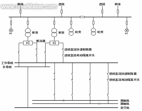 一般來講,地鐵直流牽引供電系統(tǒng)的主要一次設(shè)備是牽引變壓器和整流器(這兩種設(shè)備一般稱為牽引機(jī)組或機(jī)組)、直流斷路器和直流電動隔離開關(guān),國內(nèi)地鐵系統(tǒng)標(biāo)稱電壓主要有750V和1500V兩種;主接線形式較多,主要分為帶備用母線及其備用閘開關(guān)和不帶備用母線及其備用閘開關(guān)兩種;進(jìn)線柜有些城市設(shè)斷路器(如北京),有些城市不設(shè)斷路器(如上海、廣州);但是有一點是幾乎所有的地鐵都相同的:即同一供電區(qū)間的接觸軌或接觸網(wǎng)由相鄰的兩個牽引變電所相對應(yīng)的饋出開關(guān)同時供電,這種供電方式又稱為雙邊供電。