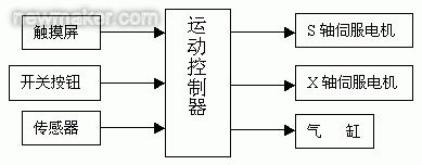 (10)電氣控制。包含電氣控制箱、觸摸屏操作盒。采用DVP-20PM00D運(yùn)動控制器作為控制核心,觸摸屏作為人機(jī)交換,伺服電機(jī)作為執(zhí)行機(jī)構(gòu),實現(xiàn)轉(zhuǎn)軸與排線的精確控制,從而保證繞線的精度。電氣控制系統(tǒng)框圖如圖4所示。
