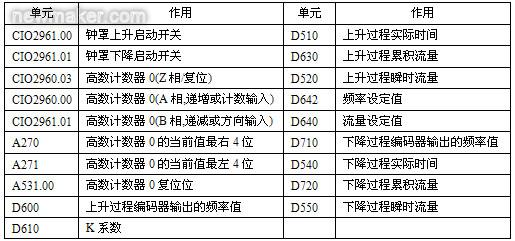 字CIO2960的位03、06、08接高速計數(shù)器0的Z、A、B。字CIO2961的位00、01接鐘罩的上升和下降啟動開關。