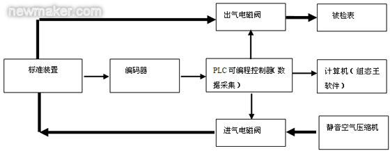 鐘罩式氣體計量裝置自動控制系統(tǒng)有:標準裝置、計算機、PLC可編程控制器、靜音空氣壓縮機、光電雙向編碼器、電磁閥等組成。