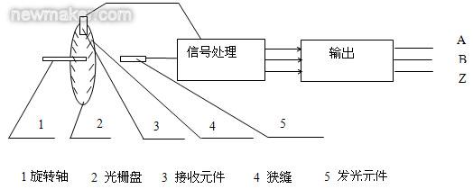光電雙向編碼器,是一種通過光電轉換將輸出軸上的機械幾何位移量轉換成電脈沖信號的傳感器。其原理框圖如圖2。為判斷旋轉方向,碼盤還可提供相位相差90o的兩路脈沖信號和零位信號。三個通道輸出信號A、B、Z。順時針旋轉時,通道A輸出波形超前通道B波形90°;逆時針旋轉時,通道A輸出波形遲通道B波形90°;光電雙向編碼器每旋轉一圈,輸出一個基準脈沖,基準脈沖的波形中心對準通道A輸出的波形。