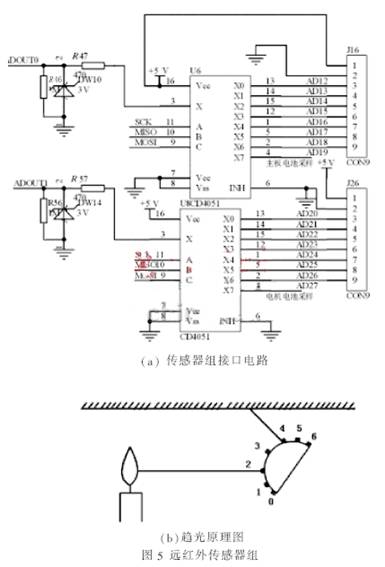 為能完成滅火任務(wù),機(jī)器人必須能確定火焰的大致位置,并能對(duì)火焰是否被撲滅做出判斷。本文設(shè)計(jì)了由28個(gè)紅外接收管組成的2個(gè)遠(yuǎn)紅外火焰?zhèn)鞲衅鹘M,前后每個(gè)方位各有14個(gè)紅外接收管組成,每2個(gè)并聯(lián)并指相同一個(gè)方向,2個(gè)傳感器組共指向14個(gè)方向,可以覆蓋360°范圍。如圖5(a)所示,14個(gè)端口通過CD4051八路轉(zhuǎn)換開關(guān)連接至ATMEGA8—16PC單片機(jī),其中SCK、MISO、MOSI為位選擇端口。此外,本設(shè)計(jì)還可以通過對(duì)14路讀取數(shù)據(jù)進(jìn)行比較,從而確定其最大最小值及相應(yīng)端口值,方便火源方位的確定。