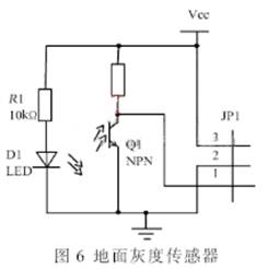 如圖6所示,地面灰度傳感器通過發(fā)光二極管LED照亮地面,地面的反射光線被光敏三極管接收,當(dāng)?shù)孛骖伾珵楹谏珪r(shí),反射的光線比較弱,則光敏三極管的基極電流越小,集電極電流也相應(yīng)較小,1端口電壓值較高,其測(cè)量值較大;反之當(dāng)?shù)孛鏋榘咨珪r(shí),反射的光線較強(qiáng),集電極電流越大,1端口電壓值較小,測(cè)量值也較小。