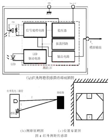 紅外測(cè)距傳感器[5-6]是機(jī)器人的“視覺器官”,通過不斷讀取其數(shù)值并進(jìn)行判斷,才能確定機(jī)器人所處位置環(huán)境,以確定機(jī)器人下一步該執(zhí)行什么命令才不致碰撞,并按照理想的路線行走。依據(jù)比賽場(chǎng)地規(guī)格,本機(jī)器人采用SHARP公司的GP2D12PSD傳感器(后面簡(jiǎn)稱PSD傳感器),其有效測(cè)距范圍為10 cm~80 cm。其原理如圖4(a)所示。