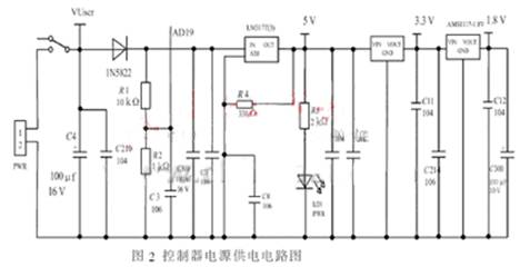為獲得CPU各端口電路所需要的不同等級(jí)的電壓,本設(shè)計(jì)采用1個(gè)LM317T三端穩(wěn)壓器和2個(gè)AMS1117低壓差線性電壓調(diào)整器,并通過其附屬電路,得到精確穩(wěn)定的5 V、3.3 V、1.8 V 三種電壓;采用1個(gè)發(fā)光二極管LD1和限流電阻R5作為電源指示燈,以顯示電源開關(guān)的狀態(tài);為實(shí)時(shí)采樣電源電壓,防止鋰電池過放或過充,設(shè)計(jì)中通過R1、R2分壓,引出AD19端口作為電源采樣端口。