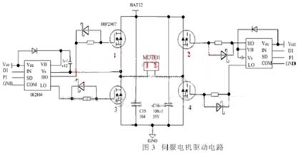 由于電機(jī)功率較大,并要求能實(shí)現(xiàn)雙向、可調(diào)速運(yùn)行,本文設(shè)計(jì)了半橋式電力MOSFET管,成功實(shí)現(xiàn)了對(duì)電機(jī)的控制。如圖3所示,2路PWM信號(hào)通過IR2104半橋驅(qū)動(dòng)器(half-bridge driver)和相應(yīng)保護(hù)電路連接至型號(hào)為IRF2807 的MOSFET管,控制電源與電動(dòng)機(jī)連接線路的通與斷,達(dá)到控制電機(jī)速度的目的。當(dāng)PWM信號(hào)占空比較大時(shí),線路導(dǎo)通時(shí)間長(zhǎng),電機(jī)速度大;相反,當(dāng)PWM占空比較小時(shí),線路導(dǎo)通時(shí)間短,電機(jī)速度小。4個(gè)MOSFET管在不同時(shí)刻導(dǎo)通組合,實(shí)現(xiàn)控制電機(jī)轉(zhuǎn)動(dòng)方向:當(dāng)MSFET管1和4導(dǎo)通時(shí),電機(jī)端口1為正、2為負(fù),電機(jī)正轉(zhuǎn);當(dāng)MOSFET管2和3導(dǎo)通時(shí),電機(jī)端口2為正、1為負(fù),電機(jī)反轉(zhuǎn)。
