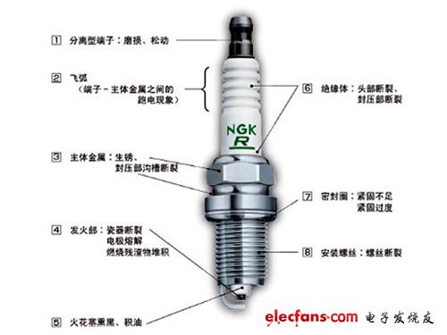 ????火花塞,通過接收高壓導線送來的脈沖電壓,放電擊穿火花塞兩電極間的空氣,從而產生火花引燃氣缸內的混合氣體,來完成化學能向動能的轉化。不過在柴油發(fā)動機上,由于采用壓燃方式自動著火,并不需要安裝火花塞。火花塞由絕緣體和能導電的金屬殼體組成,絕緣體的主要任務是讓高壓電順利經過兩極,因若沒有它,懶惰的高壓電會“抄小路”不經過兩極,便不能產生火花,自然也就沒有汽車行駛所需要的能量產生了。