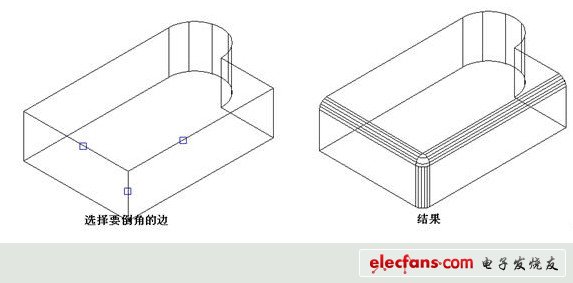 CAD的Fillet命令不僅可以對(duì)二維線形進(jìn)行倒角,也可以對(duì)三維實(shí)體進(jìn)行倒角。當(dāng)選擇三維實(shí)體上需要倒角的邊時(shí),會(huì)提示輸入圓角半徑,輸入半徑后可以選擇一條或多條邊同時(shí)倒圓角,如下圖所示。
