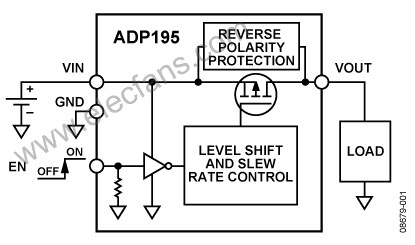 The ADP195 is a high-side load switch designed for operation between 1.1 V to 3.6 V and protected against reverse current flow from output to input.