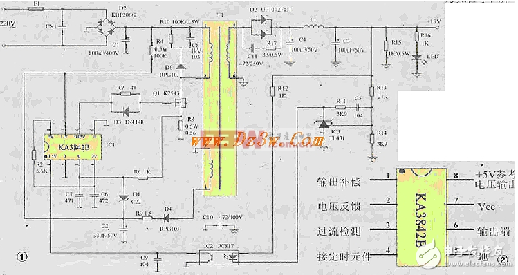 關(guān)鍵字:KA3842,電動車充電器電路圖