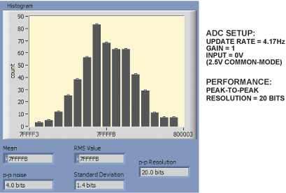 在選擇ADC的輸入通道、輸入范圍和更新速率之后,現(xiàn)在我們利用ADC Stats屏幕,如圖11所示,顯示一些被測量的數(shù)據(jù)。在這個(gè)屏幕上,用戶選擇數(shù)據(jù)點(diǎn)的數(shù)目進(jìn)行記錄;軟件生成所選通道的柱狀圖,計(jì)算峰-峰(P-P)和有效值(RMS)噪聲并顯示結(jié)果。在此處顯示的測量范例中,輸入信號通過AD8220被連接到AD7793:增益=1,更新速率=16.7Hz,采樣數(shù)=512,輸入范圍=±10V,輸入電壓=2.5V。峰-峰分辨率為18.2位。