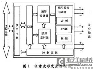 任意波形發(fā)生器如圖l所示,可以以單端和差分模式工作,具有完整的波形發(fā)生能力,可以產(chǎn)生可修改的復(fù)雜波形,具有激勵(lì)被測(cè)器件所需的定時(shí)功能。 AWG作為VXI儀器系統(tǒng)的一個(gè)模塊,通過(guò)標(biāo)準(zhǔn)化的接口模塊與資源控制器通信,當(dāng)需要產(chǎn)生激勵(lì)波形時(shí),資源控制器發(fā)送命令和參數(shù)到AWG模塊,AWG模塊采用高速DSP芯片作為主處理器,DSP與波形定時(shí)器和控制邏輯一起完成任意波形的產(chǎn)生,從而提供給被測(cè)器件(DUT)所需的激勵(lì)波形。由于被測(cè)芯片種類繁多,頻帶范圍很寬,對(duì)于不同的被測(cè)芯片,采用的定時(shí)器和控制邏輯都不盡相同,而且,隨著電子技術(shù)的發(fā)展,頻率合成技術(shù)已經(jīng)廣泛應(yīng)用到測(cè)試測(cè)量領(lǐng)域,采用數(shù)字頻率合成(DDS)專用芯片使得電路更加簡(jiǎn)潔可靠,因此,任意波形發(fā)生器的設(shè)計(jì)也更加容易,其抗干擾能力和精度都更加容易保證。