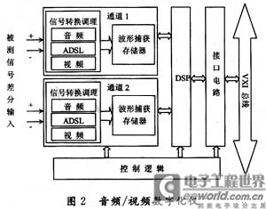 音頻/視頻數(shù)字化儀如圖2所示,主要由信號(hào)轉(zhuǎn)換和調(diào)理電路、波形存儲(chǔ)器、DSP、控制邏輯和接口電路等組成。AVD可以設(shè)計(jì)多個(gè)通道,每個(gè)通道擁有獨(dú)立的硬件資源,可以捕獲各種頻帶的被測(cè)信號(hào)。同樣,AVD也是一個(gè)標(biāo)準(zhǔn)化的VXI儀器模塊,也在資源控制器的控制下與AWG及其他模塊一起完成測(cè)試任務(wù)。AVD模塊中包含一個(gè)高速DSP芯片作為核心處理器,一方面,DSP中植入了大量的信號(hào)處理庫(kù)函數(shù),諸如FFT、數(shù)字濾波器等任務(wù)都可在DSP中完成;另一方面,一些測(cè)試算法也可以移植到DSP中來(lái)做,因此,在AVD模塊內(nèi)部就可以得到一些測(cè)試數(shù)據(jù)的中間結(jié)果,使得傳送到主機(jī)的數(shù)據(jù)量大大減少,VXI總線上的數(shù)據(jù)被大量分流,同時(shí),主機(jī)的計(jì)算量也被DSP芯片分擔(dān),這對(duì)于縮短測(cè)試時(shí)間有重要作用。在對(duì)大規(guī)模混合信號(hào)芯片進(jìn)行多片并測(cè)時(shí),采用多片DSP并行的結(jié)構(gòu),在AVD模塊內(nèi)部完成大量的信號(hào)處理和測(cè)試算法,能更加顯著地提高測(cè)試效率。