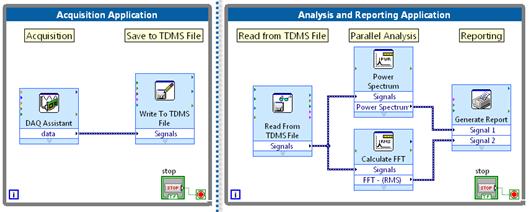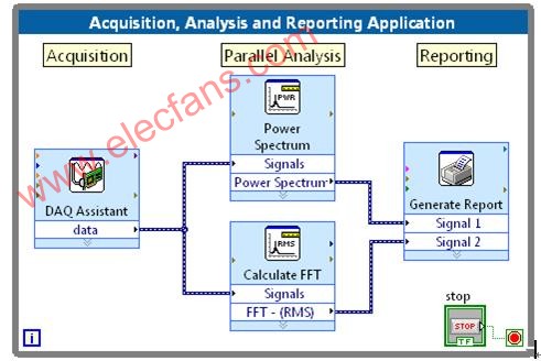 圖1. 使用LabVIEW的數(shù)據(jù)流編程,在線分析和報告與數(shù)據(jù)采集集成在一起。