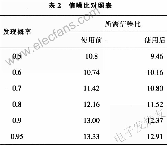 根據(jù)上述提供的等幅線性調(diào)頻信號(hào)模型和巴克碼序列,利用Labview軟件產(chǎn)生相應(yīng)的等幅線性調(diào)頻信號(hào),三相編碼,五相編碼,七相編碼信號(hào)。根據(jù)MTI和 MTD原理,對上述信號(hào)進(jìn)行處理。從圖1的仿真結(jié)果可以看出,經(jīng)過MTI處理后,一些固定雜波(目標(biāo)2,目標(biāo)3,目標(biāo)4)經(jīng)過脈沖對消,匹配濾波,盲速處理,幅度明顯減少,淹沒在噪聲中。運(yùn)動(dòng)目標(biāo)信號(hào)明顯出現(xiàn)在顯示器上。改善因子是衡量MTI雷達(dá)工作質(zhì)量的一個(gè)重要指標(biāo),定義為輸出信號(hào)雜波功率比和輸入信號(hào)雜波功率比之比值。經(jīng)過上述MTD濾波器處理后,目標(biāo)凸現(xiàn)。MTD濾波器組中8個(gè)濾波器對雜波的改善因子分別是 (58.6245,58.8137,58.8260,66.8277,68.0534,59.0719,58.5206,57.8894)。表2給出了在給定發(fā)現(xiàn)概率的情況下,使用MTD濾波器前后系統(tǒng)所需的信噪比,可以看出:對信噪比的要求有所降低,因此可以更好檢測目標(biāo)。