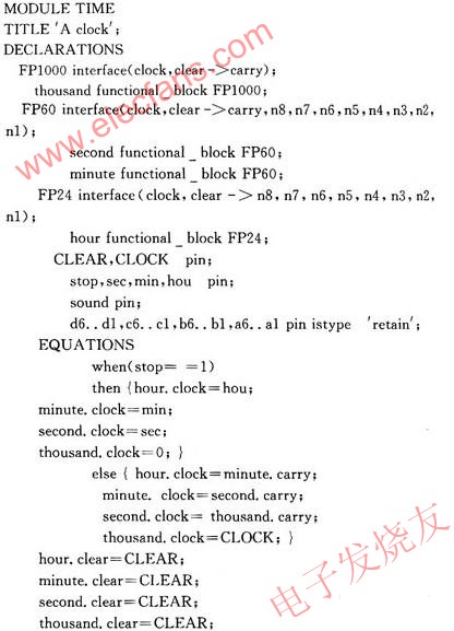 下面用ABEL語言的層次結(jié)構(gòu)實現(xiàn)電子鐘的設(shè)計可分為頂層模塊Clock,3個底層模塊FP1000,F(xiàn)P60和FP24。下面介紹頂層模塊CLOCK,其中調(diào)用了3個底層模塊。