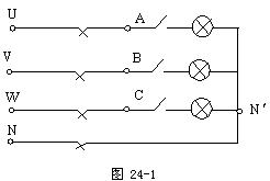 (2)在無中線的情況下,測量三相負(fù)載對稱和不對稱時的各相電流、各相電壓和電源中點N到負(fù)載中點Nˊ的電壓UNNˊ,將數(shù)據(jù)記入表24-1中,并記錄各燈的亮度。