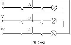 實驗電路如圖24-2所示,將白熾燈按圖所示,連接成三角形接法。調(diào)節(jié)三相調(diào)壓器的輸出電壓,使輸出的三相線電壓為220V。測量三相負(fù)載對稱和不對稱時的各相電流、線電流和各相電壓,將數(shù)據(jù)記入表24-2中,并記錄各燈的亮度。(EEL—ⅤB為三相不可調(diào)交流電源,輸出的三相線電壓為380V)