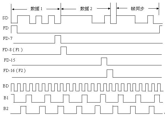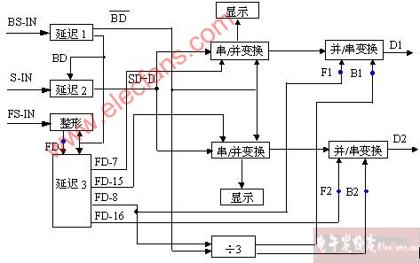 ??? 延遲1、延遲2、延遲3、整形及÷3等5個(gè)單元可使串/并變換器和并/串變換器的輸入信號(hào)SD、位同步信號(hào)及幀同步信號(hào)滿足正確的相位關(guān)系,如圖7-3所示。