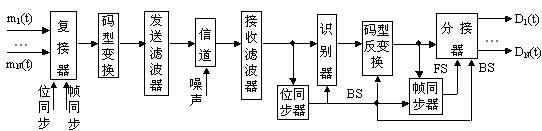??? 圖7-5為時(shí)分復(fù)用數(shù)字基帶通信系統(tǒng)原理方框圖。復(fù)接器輸出時(shí)分復(fù)用單極性不歸零碼(NRZ碼),碼型變換器將NRZ碼變?yōu)檫m于信道傳輸?shù)膫鬏敶a(如HDB3碼等),發(fā)濾波器主要用來限制基帶信號(hào)頻帶,收濾器可以濾除一部分噪聲,同時(shí)與發(fā)濾波器、信道一起構(gòu)成無碼間串?dāng)_的基帶傳輸特性。復(fù)接器和分接器都需要位同步信號(hào)和幀同步信號(hào)。