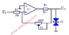 (1)按圖接線,并將Rf調(diào)為100k,Vi接DC電壓源,測出Vo由+Vom→-Vom時Vi的臨界值。