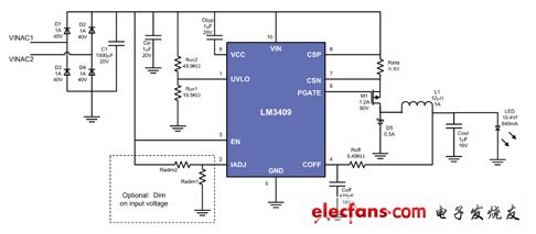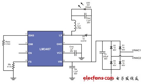 圖2 符合小型陣列設(shè)計(jì)的LM3407採用12VAC系統(tǒng),可驅(qū)動電流為350毫安培的3Vf單一LED。