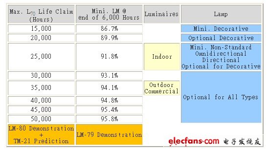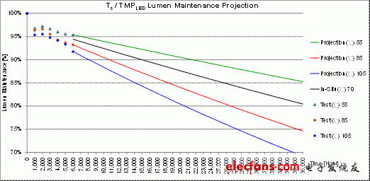 使用LM-80測試程序和TM-21外推算法的LUXEON Rebel LED測試數(shù)據(jù) 需要注意的是,目前LED的測試方法僅僅測試了LED本身的使用壽命,當(dāng)LED整合到照明系統(tǒng)中,還會有其他影響LED使用壽命的因素