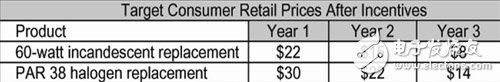 直接替換燈泡如MR16、GU10、E27投射或泛光型燈泡PAR30、PAR38(表2、3)、AR111等較大型燈泡,LED產(chǎn)生的熱,加上變壓或恆流驅(qū)動電源模組所發(fā)出的熱,在有限尺寸散熱面積下,使得小型投射燈泡無法跨越5瓦、300流明門檻;中大型投射燈泡,如帕(PAR)燈等無法跨越13瓦的門檻。相較于傳統(tǒng)光源,小型LED燈泡有十倍至數(shù)十倍的市場價差,而中大型LED燈泡則有數(shù)倍到十數(shù)倍的價差,要達一定產(chǎn)量而壓低成本,以提高市場滲透率,則需要加倍的系統(tǒng)流明數(shù)、減半的發(fā)熱源,以及現(xiàn)今叁分之一的售價,才能使其大量應(yīng)用在燈泡的替換上,預(yù)計至2015年將有可能成行。
