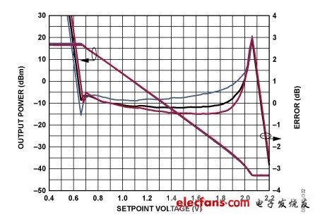 圖2 ADL5330輸出功率與AD8318設(shè)定點(diǎn)電壓關(guān)系曲線,PIN=-1.5dBm