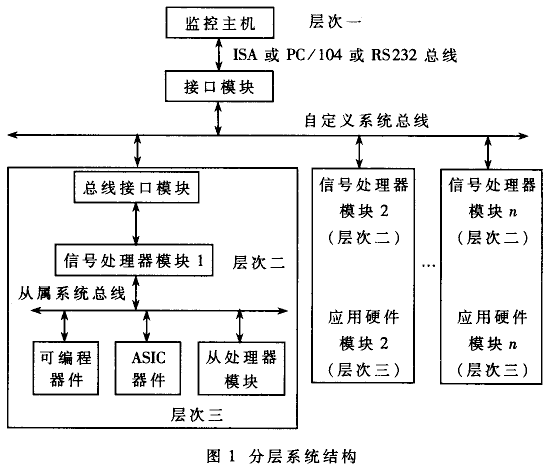 根據(jù)以上思路,系統(tǒng)宜采用分層式結(jié)構(gòu),如圖1所示。其中,自定義系統(tǒng)總線(類(lèi)似于GPIB總線)及接口模塊實(shí)現(xiàn)主機(jī)(層次一)對(duì)多個(gè)信號(hào)處理模塊(層次二、三)的監(jiān)控,基于16位ISA并行接口的設(shè)計(jì)細(xì)節(jié)參見(jiàn)參考文獻(xiàn)[2]。對(duì)于監(jiān)控主機(jī),在通過(guò)了調(diào)試階段后,可以用單片機(jī)替代之以進(jìn)一步減小體積重量,降低成本。在信號(hào)處理器模塊中,DSP芯片及其RAM與EPROM組成的最小系統(tǒng)構(gòu)成第二層次,其硬件/軟件都具有通用性。真正與具體產(chǎn)品特定功能有關(guān)的是第三層次,它是由CPLD、ASIC芯片或級(jí)聯(lián)工作的從處理器構(gòu)成的應(yīng)用硬件模塊。隨著軟件無(wú)線電技術(shù)與器件的發(fā)展,非通用性功能越來(lái)越趨向.于用軟件實(shí)現(xiàn),而應(yīng)用硬件模塊則主要是高速CPLD、偏速模/數(shù)轉(zhuǎn)換器及數(shù)/模轉(zhuǎn)換器。因此第三層次也具有一定的通用性。