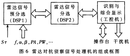 雷達(dá)對(duì)抗偵察的任務(wù)是偵收并分析敵方雷達(dá)信號(hào),為干擾或火力摧毀敵方雷達(dá)提供情報(bào)。為此研制了基于多CPU級(jí)聯(lián)工作的信號(hào)處理分機(jī),如圖6所示。它包括:雷達(dá)信號(hào)預(yù)分選模塊、分選處理模塊、識(shí)別與綜合顯示模塊。在預(yù)分選模塊中,由第一個(gè)DSP對(duì)來(lái)自參數(shù)測(cè)量分機(jī)的高速雷達(dá)視頻脈沖串進(jìn)行稀釋與粗略分類(lèi)(按頻率分),并把脈沖描述字(包括頻率f、方位、脈幅PA、脈寬PW、到達(dá)時(shí)間TOA等)通過(guò)雙口RAM傳遞給第二個(gè)DSP進(jìn)行分選處理,以分離各部雷達(dá)的脈沖信號(hào),從而測(cè)得各自技術(shù)參數(shù)。工控機(jī)獲得測(cè)量參數(shù)后與雷達(dá)情報(bào)數(shù)據(jù)庫(kù)比對(duì),以識(shí)別敵方雷達(dá)類(lèi)型、用途與威脅等級(jí),為指揮決策提供依據(jù)。按處理速度、傳輸速度、存儲(chǔ)容量?jī)?yōu)化配置流水線上各級(jí)CPU的任務(wù),可使整個(gè)系統(tǒng)達(dá)到最大處理能力。試驗(yàn)表明其速度已符合實(shí)戰(zhàn)要求。