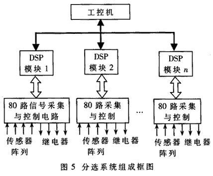 為了適應(yīng)市場(chǎng)需要,對(duì)材料(如糧食、礦物等)進(jìn)行質(zhì)量檢測(cè)與分選有著重要意義。分選是利用不同質(zhì)量材料的重量、顏色、尺寸等物理特性不同的原理進(jìn)行的。根據(jù)該原理,本實(shí)驗(yàn)室開(kāi)發(fā)研制了基于多DSP的材料分選控制系統(tǒng)。國(guó)內(nèi)早期的分選系統(tǒng)智能部件都采用MCS-51系列的單片機(jī),其控制功能基本可以滿(mǎn)足需要,但是它的計(jì)算精度和工作速度卻遠(yuǎn)遠(yuǎn)不夠,因此系統(tǒng)的分選精度等指標(biāo)很難做高。本文所研制的新型分選系統(tǒng)采用高速浮點(diǎn)運(yùn)算DSP芯片TMS320VC33完成多通道信號(hào)采集和分選的控制,使得分選精度和工作速度都得到了大幅度提高。每個(gè)DSP可以勝任80路5kHz帶寬的傳感器信號(hào)的分析處理,每臺(tái)工控機(jī)最多可管理16個(gè)DSP模塊的并行工作,因而總的分選速度是非??斓摹7诌x系統(tǒng)組成框圖如圖5所示。