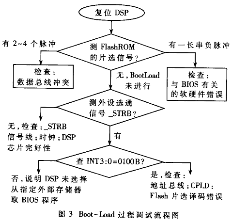 · 把DSP-BIOS軟件燒寫(xiě)入Flash-ROM,調(diào)試確認(rèn)DSP的Boot-Load過(guò)程。若BIOS程序未正常運(yùn)行,可按流程圖3來(lái)調(diào)試。