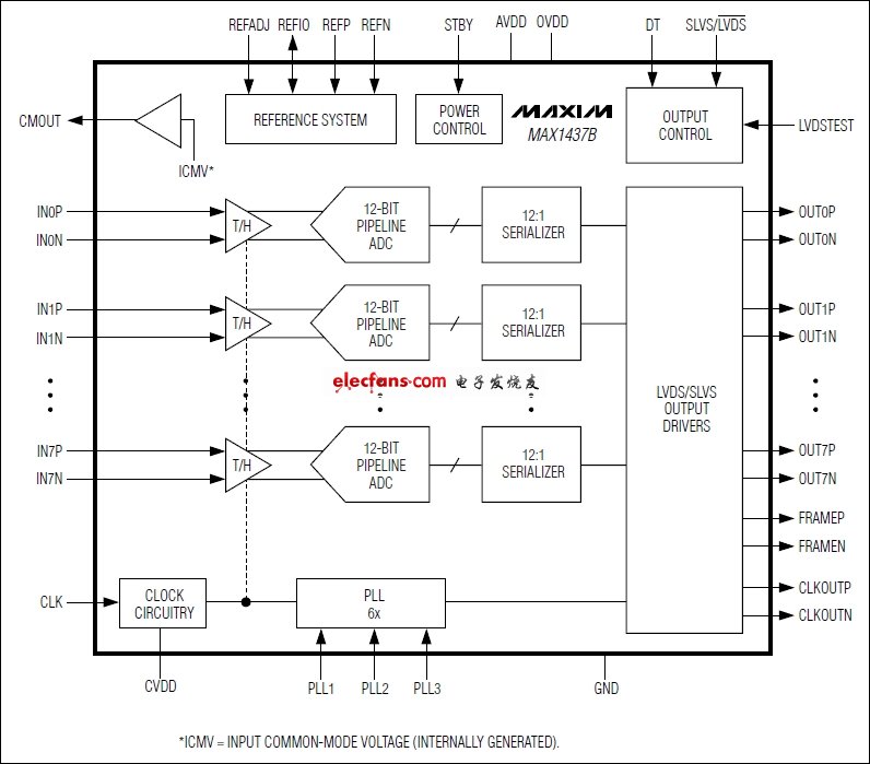 The MAX1437B octal, 12-bit analog-to-digital converter(ADC) features fully differential inputs, a