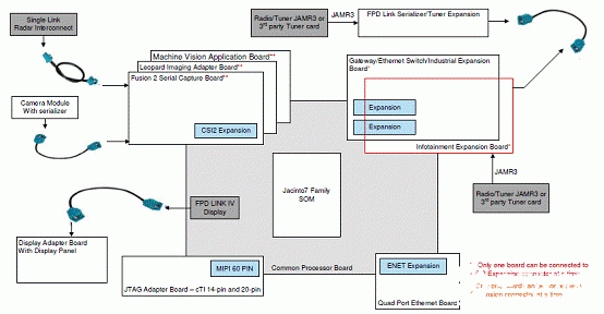 J721E EVM sub system has been designed to enable customers to evaluate the Processor’s performance with flexibility. To have flexibility while developing the system, different interface/expansion boards have been designed. Some examples include: