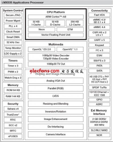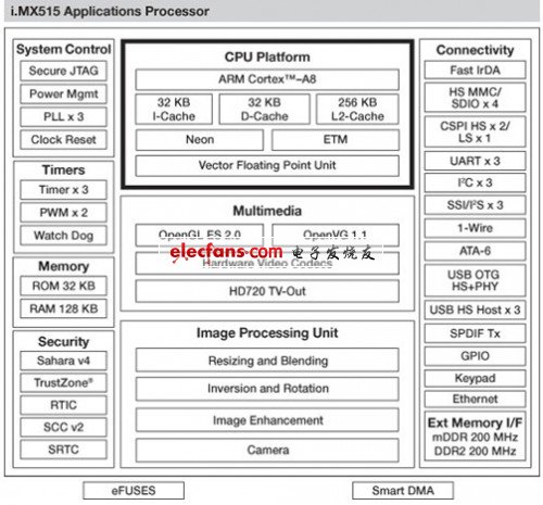 在i.MX515多媒體應(yīng)用處理器提供高性能的處理優(yōu)化的最低功耗為 smartbooks、筆記型電腦,和許多其他消費(fèi)電子和工業(yè)應(yīng)用,以及包括︰便攜式媒體播放器、游戲機(jī)、手持設(shè)備和安全要求的應(yīng)用先進(jìn)的人機(jī)界面。它采用Freescale執(zhí)行更迅速的ARM Cortex?- A8內(nèi)核,它運(yùn)行速度高達(dá) 800兆赫。在工控設(shè)備上則在溫度更高延展性的特色下可營運(yùn)高達(dá)600兆赫。