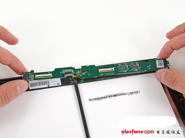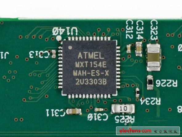 看完主板之后,我們再來看看 Surface 內(nèi)部的另外一塊小型電路板。這塊電路板的正面帶有三個 Atmel MXT154E 觸屏控制器,也就是說電路板只作用于 Surface 的 10.6 英寸屏幕。
