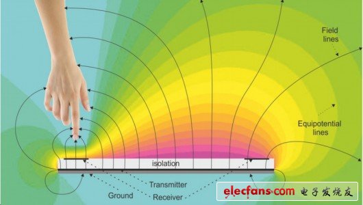 當(dāng)一名用戶將手伸進(jìn)掃描區(qū)域,電場(chǎng)就會(huì)隨之發(fā)生變化。電場(chǎng)線必須接近于和導(dǎo)體表面呈垂直狀態(tài)。上面的圖片中就有所展示。手旁邊的電場(chǎng)線由于人體自身的導(dǎo)電特性產(chǎn)生分路。手伸及感應(yīng)區(qū)域的位置對(duì)等勢(shì)線產(chǎn)生壓迫,并且降低電極信號(hào)電平。