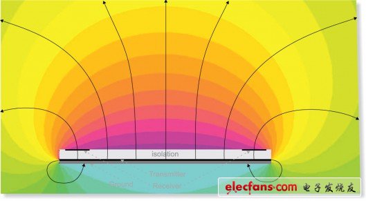 GestIC技術(shù)通過周圍電場(chǎng)的變化來偵測(cè)手勢(shì)動(dòng)作。芯片生成勵(lì)磁電壓,頻率在100kHz左右,勵(lì)磁電壓作用于發(fā)射電極與接地層。最終建立起一個(gè)電場(chǎng),電場(chǎng)從發(fā)射電極擴(kuò)展到電極之上的掃描區(qū)域。由于勵(lì)磁電壓的波長(zhǎng)遠(yuǎn)比電極的尺寸來的大,貫穿掃描區(qū)域的電場(chǎng)就非常均衡了。