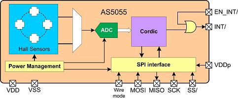 AS5055采用微型4x4 mm 16引腳封裝供貨,工作電壓為3.3V,工作溫度為-20至+85℃。