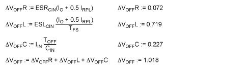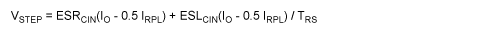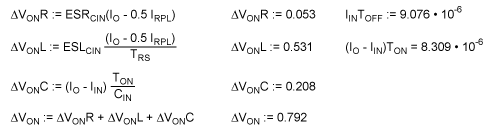 As seen in Figure 1, the output ripple current through the input capacitor results in voltage across CIN that reflects the values of ESR, ESL, and C. The ESR and ESL cause fast step voltage rise and fall, whereas C has a linear voltage rise and fall due to the fact that the capacitor charges and discharges. At the start of TON, CIN sees a negative step current, which will produce a negative step voltage given by the following equation: