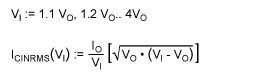 The simplified version produces only ~1.4% error, and involves only three known parameters: VI, VO, and IO. VO is fixed, and IO, VI can have a specified range, depending on the application. However, ICINRMS always has a maximum value of IO/2, which happens at VI = 2VO, and decreases the value for VI < 2IO and VI > 2LO. The plot in Figure 2 below illustrates this:![]()