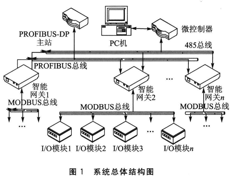 ??? 系統(tǒng)總體結(jié)構(gòu)如圖1所示。其關(guān)鍵部分是智能網(wǎng)關(guān),它實(shí)現(xiàn)了協(xié)議之間的相互轉(zhuǎn)換,無(wú)縫鏈接PROFIBUS-DP現(xiàn)場(chǎng)總線系統(tǒng)與MODBUS總線系統(tǒng),使同一系統(tǒng)內(nèi)同時(shí)存在PROFIBUS-DP總線和MODBUS總線的設(shè)備,已經(jīng)存在和使用的設(shè)備不必做任何改變就能夠直接接入PROFIBUS-DP網(wǎng)絡(luò)。