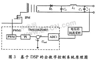 這里以數(shù)字信號(hào)處理器(DSP)TMS320LF2407為核心,設(shè)計(jì)了全數(shù)字PWM控制系統(tǒng),如圖3所示,具有更好的實(shí)時(shí)性,能很好的適應(yīng)PEMFC發(fā)電機(jī)的輸出特性。