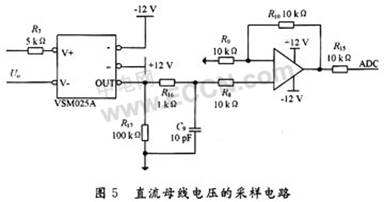 為了保證電路的可靠運(yùn)行,電壓的采樣最好能夠與控制電路隔離,這樣能夠避免主電路中大電流流過地線時(shí)壓降帶來(lái)的干擾。在本機(jī)中,通過電壓霍爾元件實(shí)現(xiàn)控制電路與主電路的隔離?;魻栯妷涸脑硎牵簩⒋箅娮璐穗妷杭盎魻栐脑?,得到原邊電流,該電流能在副邊產(chǎn)生一定比例的副邊電流,副邊電流流過電阻產(chǎn)生的壓降能夠反應(yīng)主電路的電壓值。所設(shè)計(jì)的DC/DC變換器的輸出直流電壓的采樣電路如圖5所示。