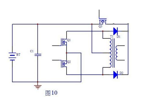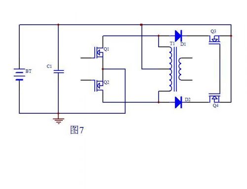 上面我們已經(jīng)分析了Q1,Q2兩管漏極產(chǎn)生尖峰的原因,下面我們就來想辦法消除這個尖峰了。我想到的辦法就是Q1,Q2的漏極到電池的正極加一個開關(guān),當(dāng)然這個開關(guān)也由MOS管來充當(dāng),當(dāng)然其它功率管也行。這個開關(guān)只在Q1,Q2都截止時才導(dǎo)通,用電路實現(xiàn)如圖7所示: