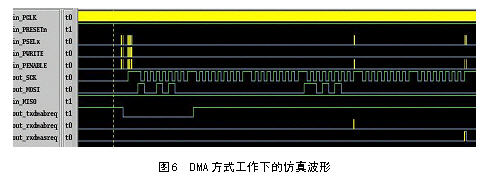 AMBA規(guī)范是由ARM公司制定的片上總線規(guī)范,為SoC的設(shè)計(jì)提供了以下優(yōu)點(diǎn):較好的可移植和可復(fù)用設(shè)計(jì)、低功耗設(shè)計(jì)、高性能和結(jié)構(gòu)可移植的系統(tǒng)設(shè)計(jì)以及較好的可測(cè)性設(shè)計(jì)[5]。SPI是APB總線上的Slave模塊。APB總線時(shí)序比較簡(jiǎn)單,有興趣的讀者可以查閱ARM公司的《AMBA Specification》(Rev 2.0)。因?yàn)榇薙PI模塊支持3種DMA操作,所以除標(biāo)準(zhǔn)APB信號(hào)線外,還有3根與DMA模塊連接的請(qǐng)求信號(hào)線。